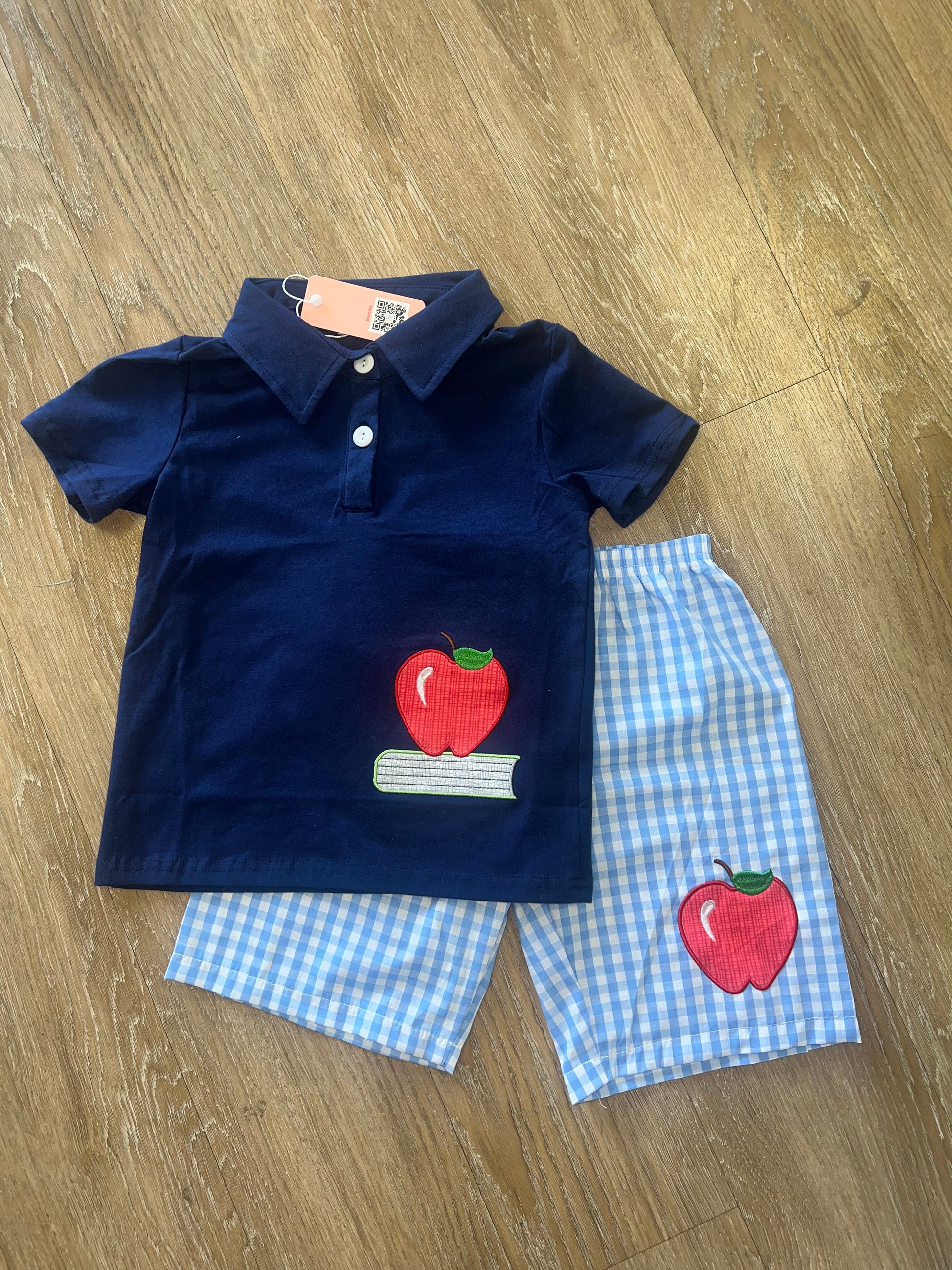This charming two-piece set features a navy blue polo shirt adorned with a playful apple design resting on a stack of books, making it both fun and academic. The matching blue gingham shorts complete the look with a coordinating apple applique. Perfect for your little scholar, this outfit is both cute and comfortable, ideal for everyday adventures and school days alike.