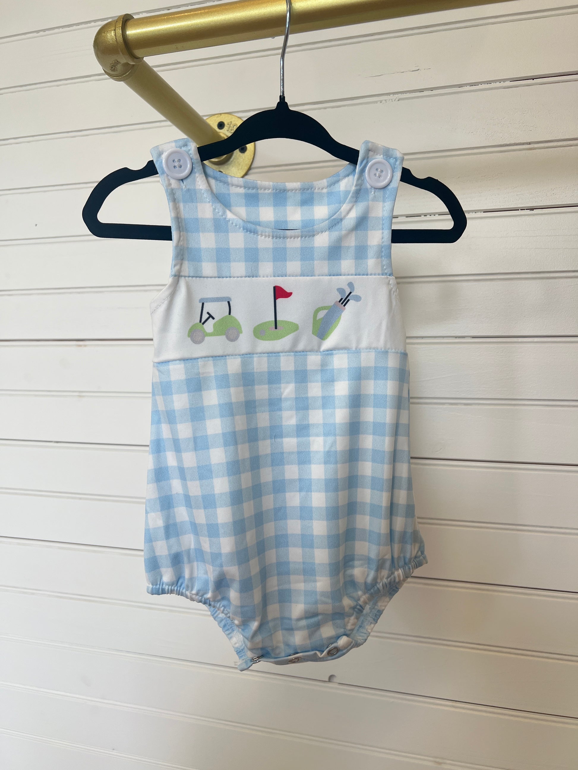 This adorable baby boy romper features a classic blue and white plaid pattern that brings a timeless, preppy charm. Designed with buttoned straps easy for dressing and a secure fit, it's perfect for warm weather adventures. On the chest, a playful embroidered design adds a fun, sporty touch: a cheerful golf cart, a set of golf clubs, and a little golf flag waving in the breeze. It's the perfect outfit for a day on the green--or just looking extra handsome off the course!