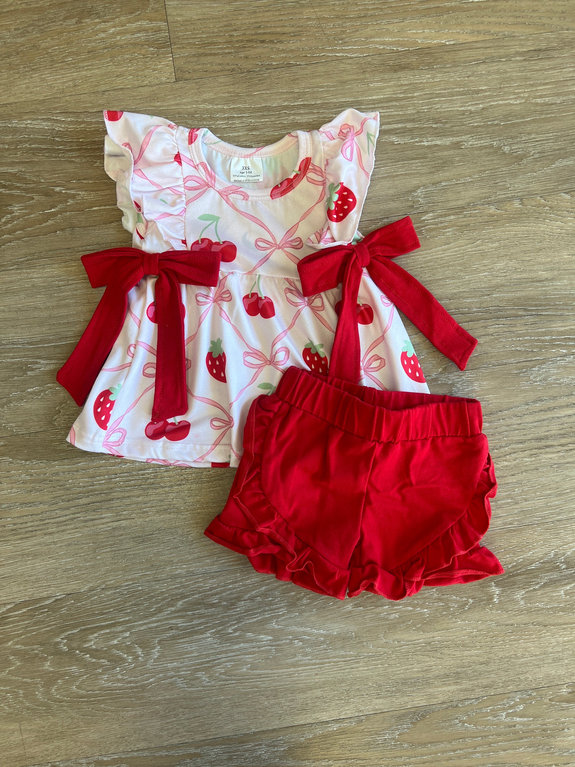 Sweeten her summer wardrobe with our Berry Sweet Bow Set! This darling outfit features a flutter-sleeve tunic adorned with playful strawberries, cherries, and dainty pink bows, tied together with bold red side bows for an extra pop of charm. Paired with matching red ruffle shorts, it’s the perfect blend of comfort, cuteness, and berry-bright fun.