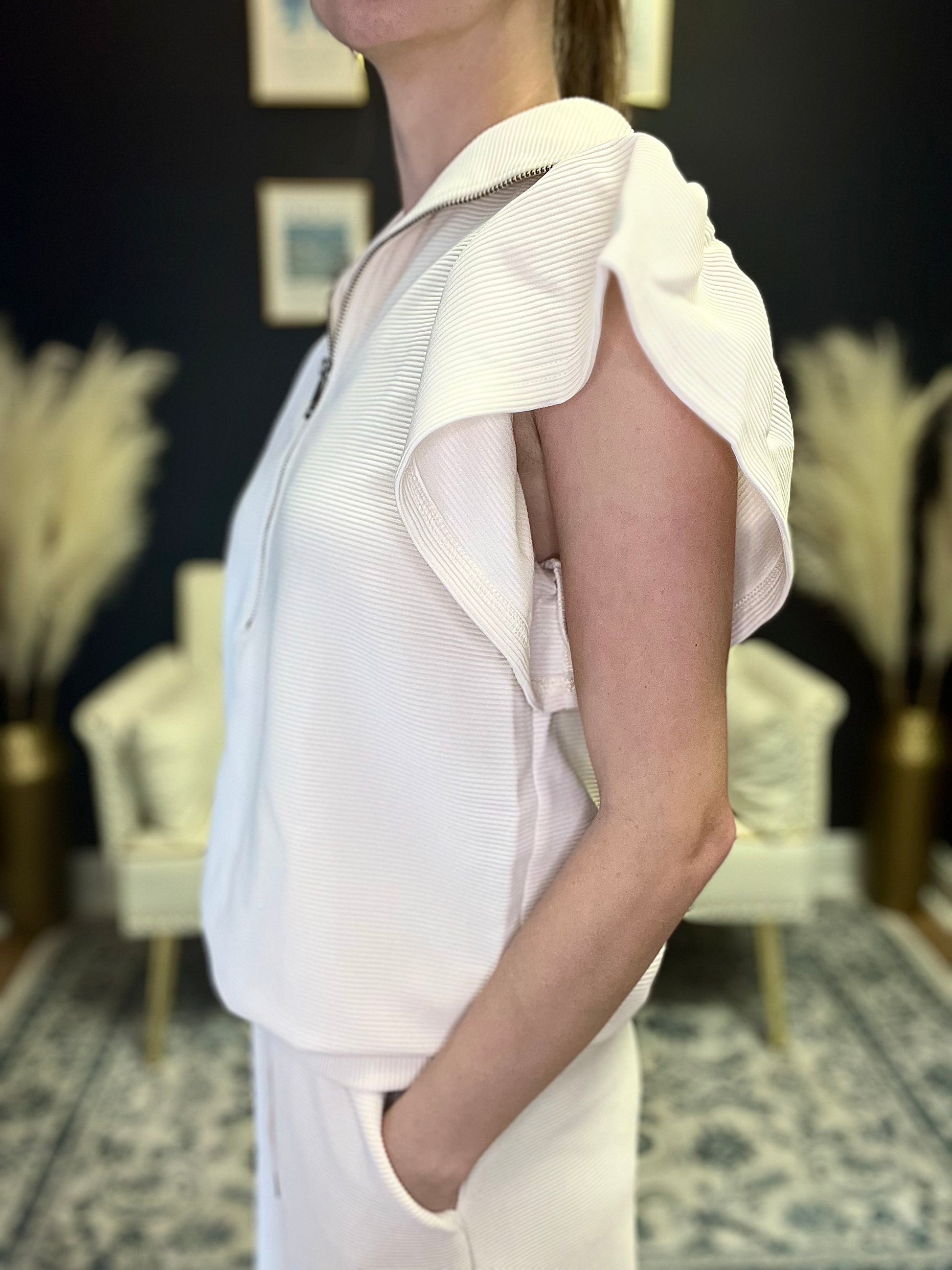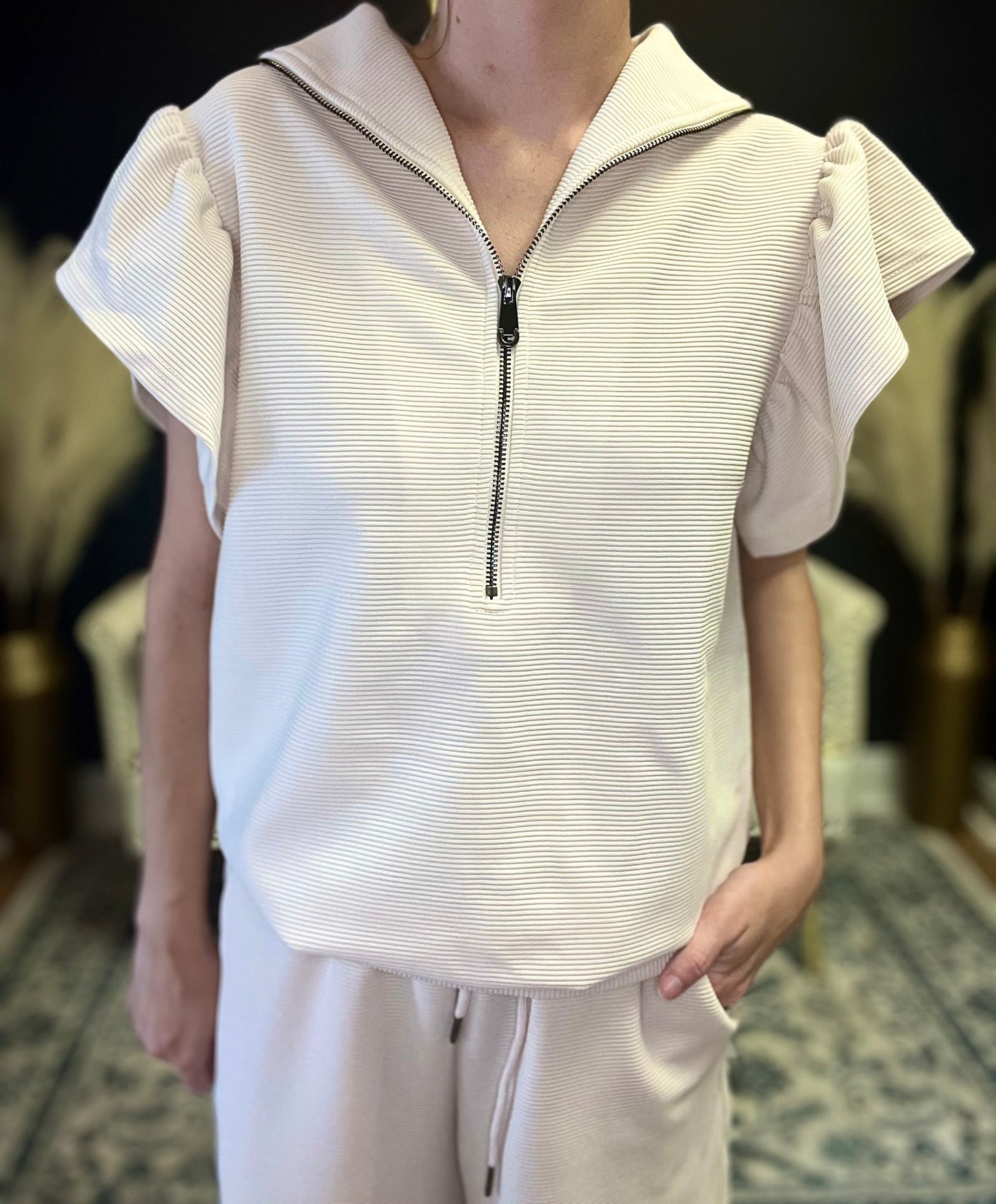 Where comfort meets quiet luxury — the Chic Harmony Set brings elegance to everyday dressing. Designed in a soft, textured fabric with a creamy beige hue, this two-piece set features a flowy wide-leg pant with an adjustable drawstring waist and a matching top with a half-zip collar and flutter sleeves that add just the right amount of drama. Perfect for elevating your lounge look, it effortlessly transitions from cozy at home to polished in public. Style it with heels and a mini bag for a minimalist-chic vibe that speaks volumes. ✨🤍