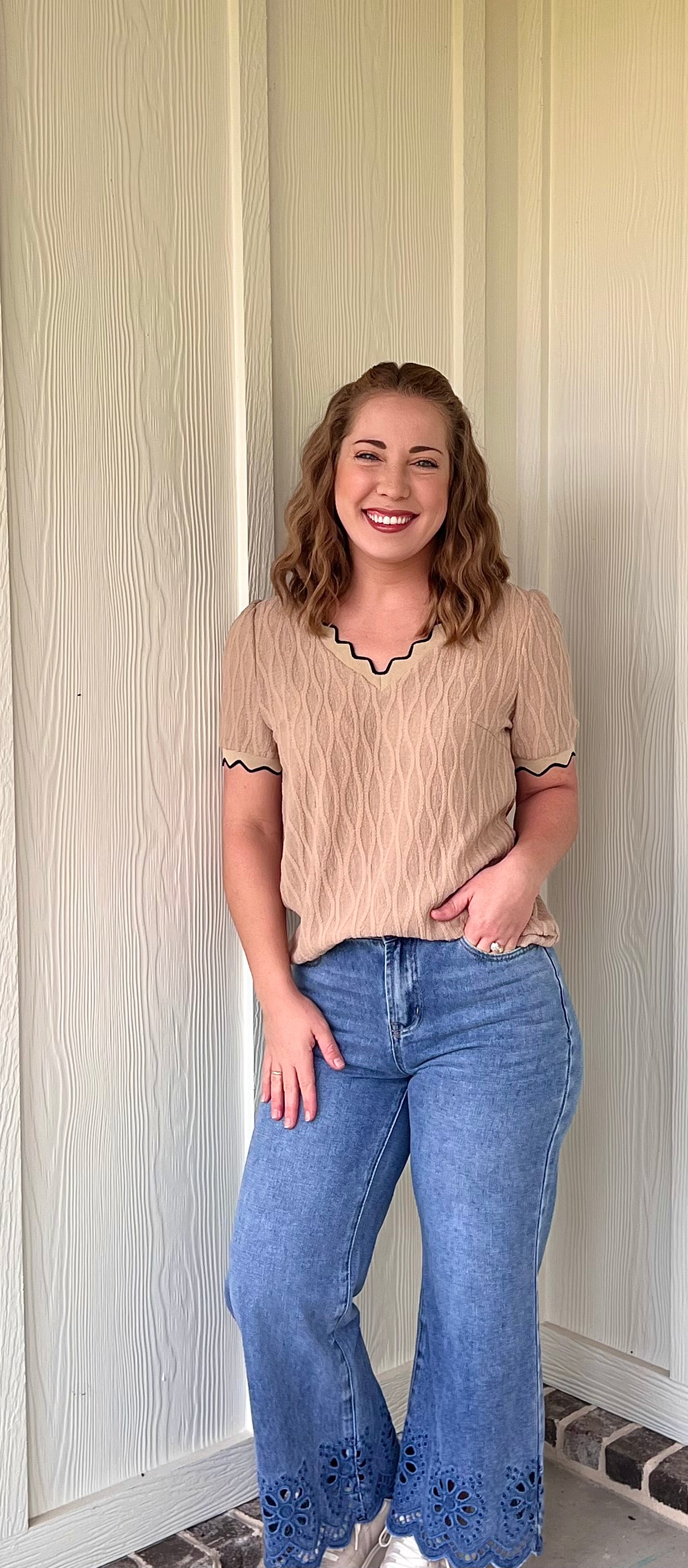 Elevate your everyday look with The Elena Knit Top, a soft, textured knit blouse in a warm neutral beige. Featuring an elegant scalloped V-neckline with black contrast trim and subtle puff sleeves with matching edging, this top blends classic femininity with a modern twist. The lightweight fabric and relaxed fit make it perfect for dressing up or down—whether you’re pairing it with distressed shorts for a casual chic vibe or layering it under a blazer for a polished touch.