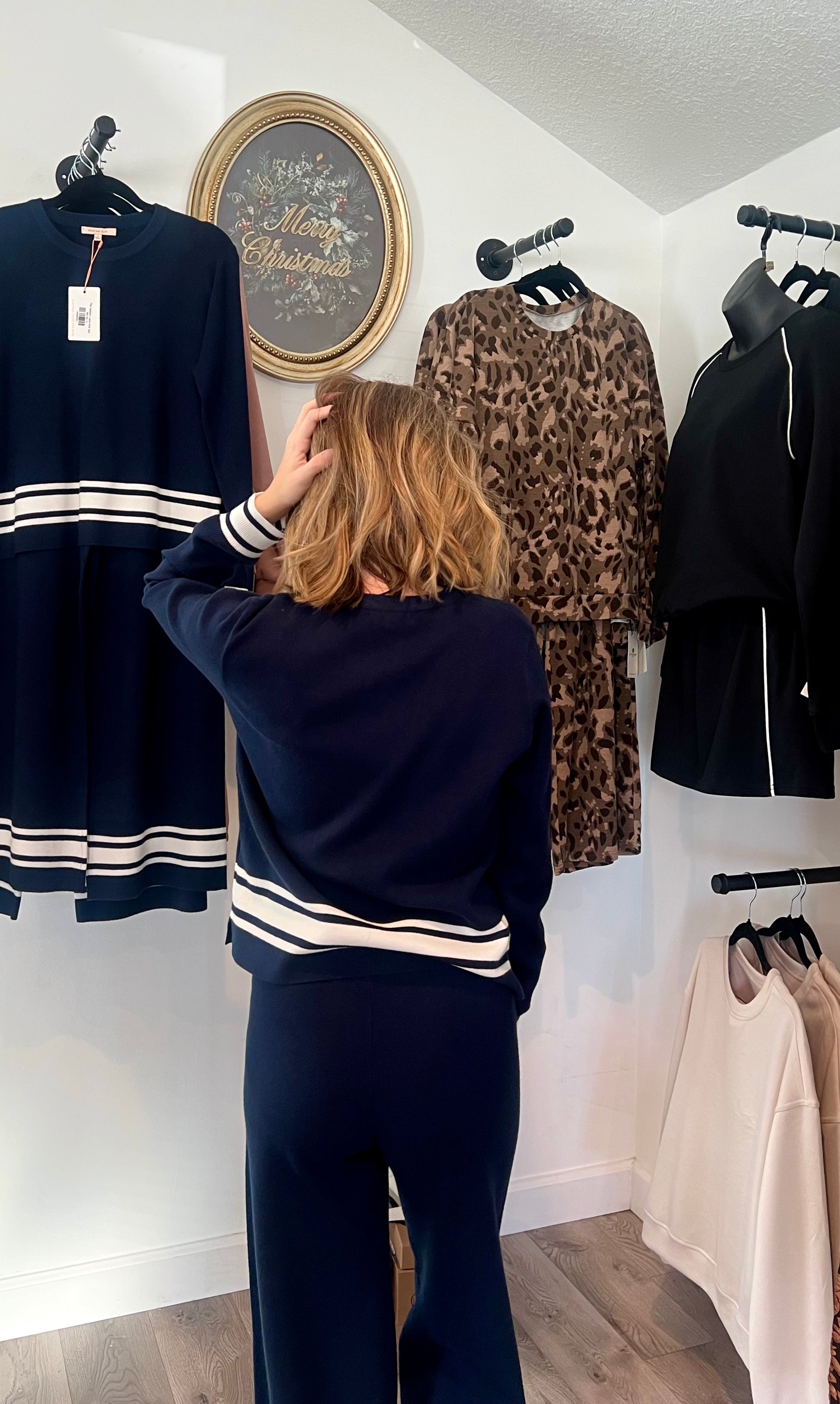 Classic, polished, and effortlessly chic -- The Harbor Lane Knit Set brings a timeless, coastal-inspired look to your everyday style. This deep navy two-piece set features a soft long-sleeve crewneck top paired with relaxed knit pants, both finished with clean ivory stripe detailing that adds the perfect touch of sophistication.