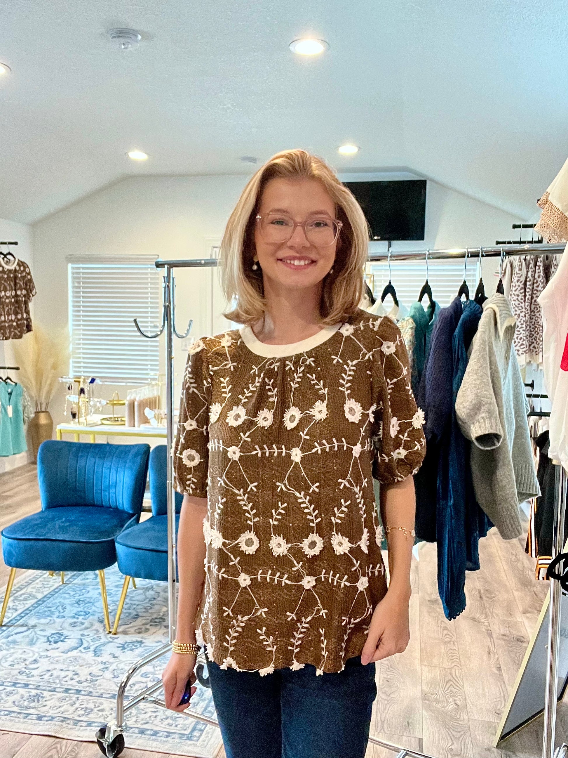 Delicate and timeless, the Lillian Embroidered Top captures effortless femininity with its soft floral detailing and vintage-inspired charm. The 3D white embroidery blooms beautifully against the rich brown backdrop, while the contrast neckline adds a touch of polish. Easy to dress up or down, Lillian pairs perfectly with high-waisted denim or a flowy skirt for a graceful, everyday look.
