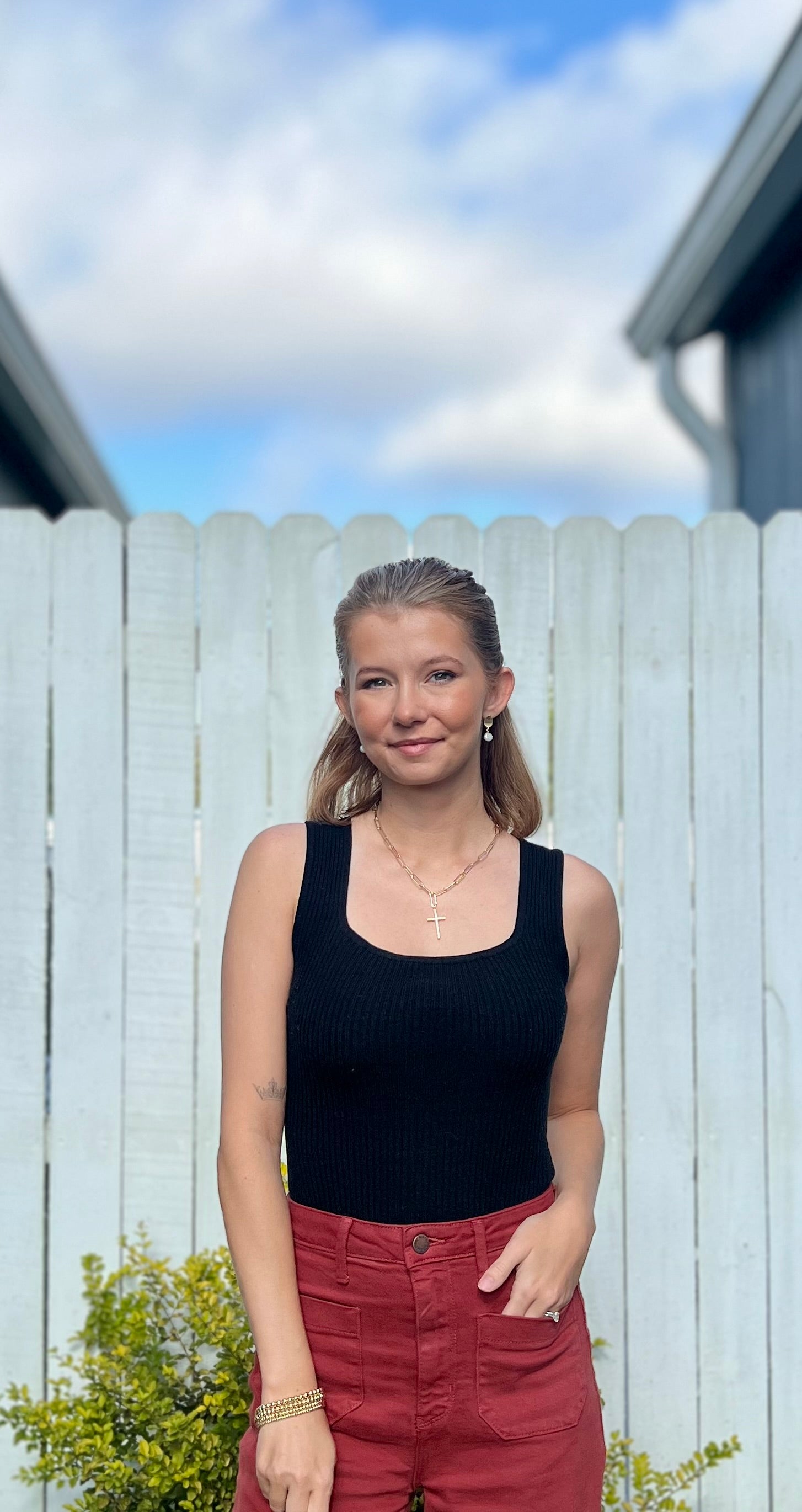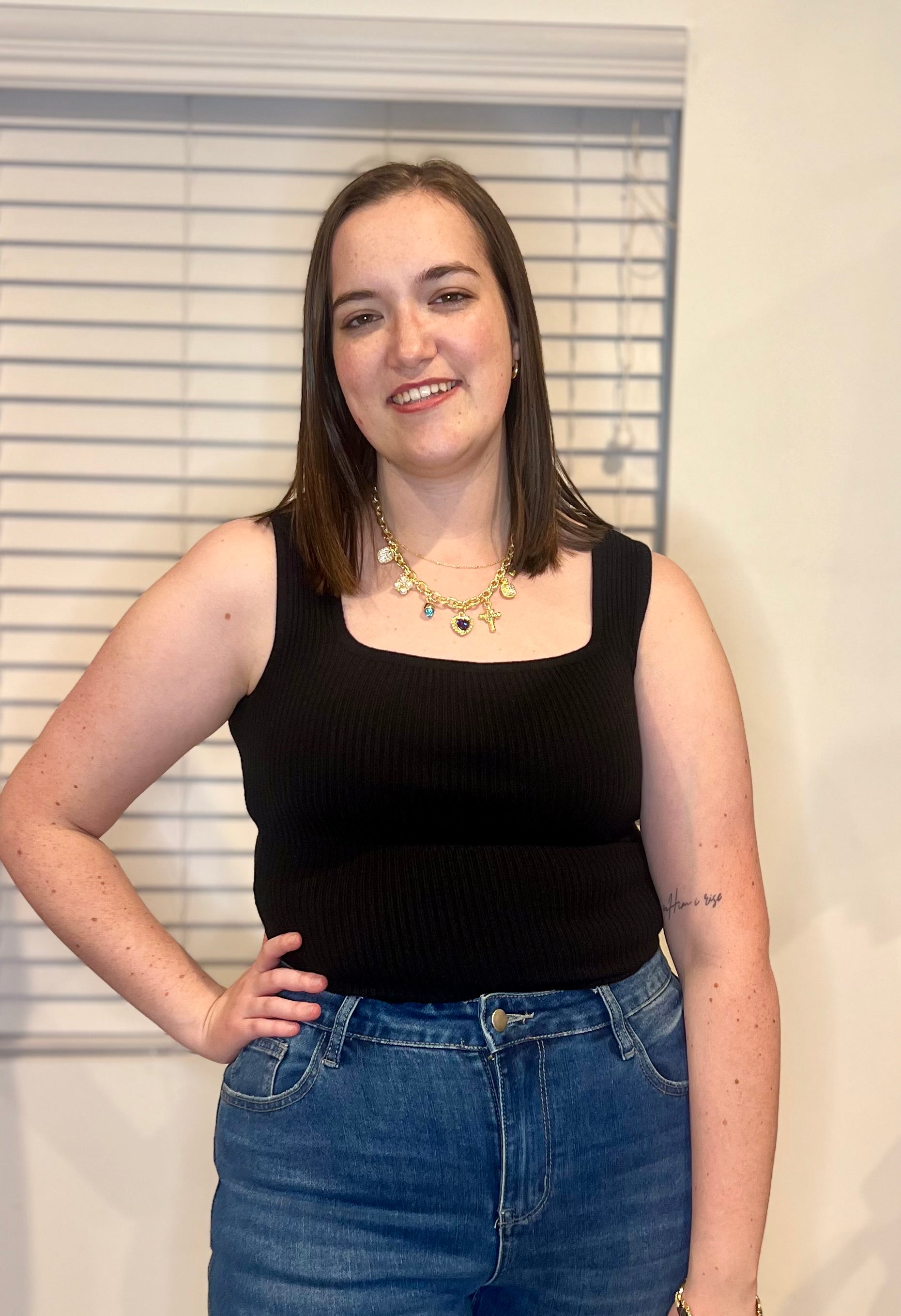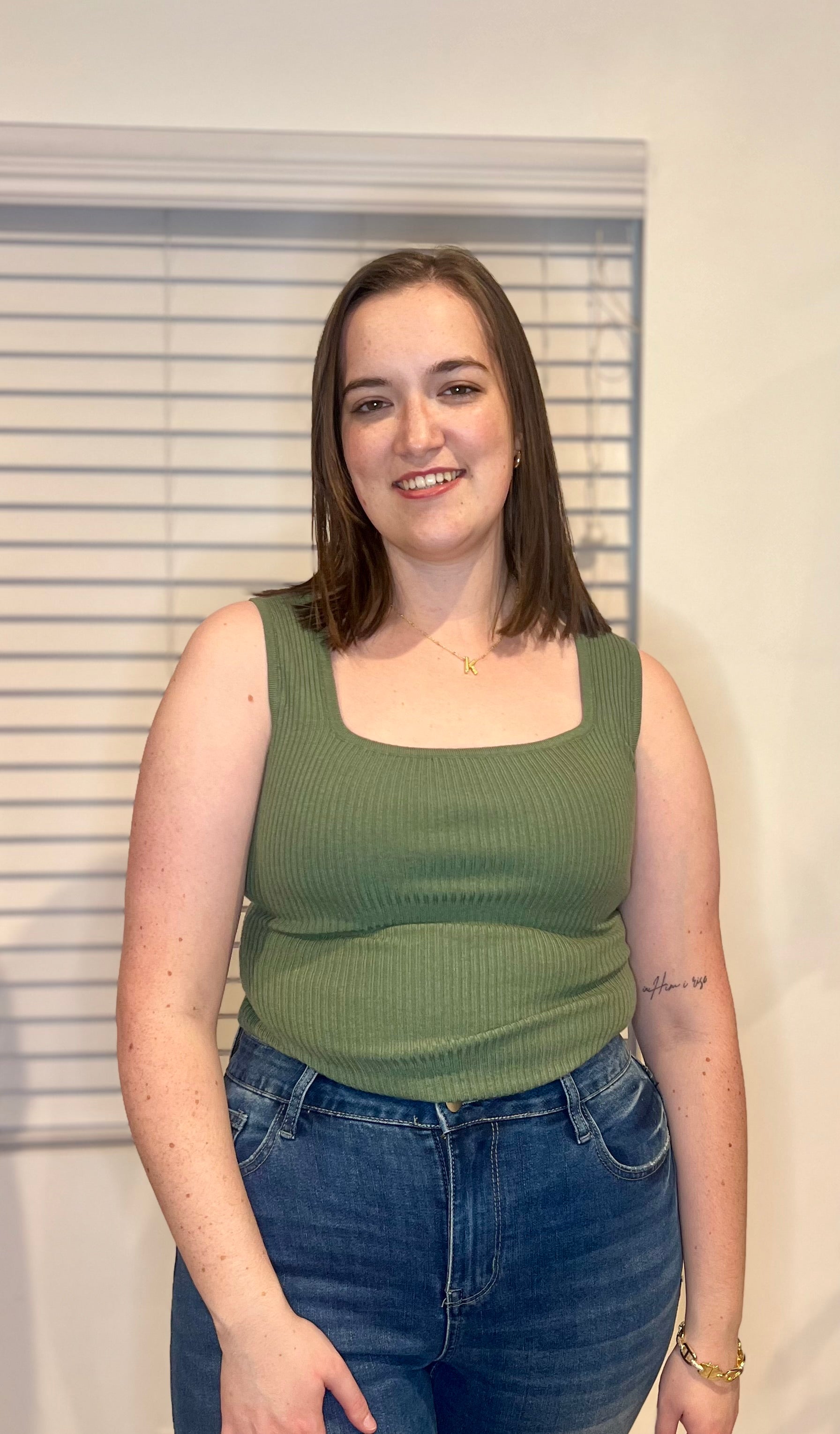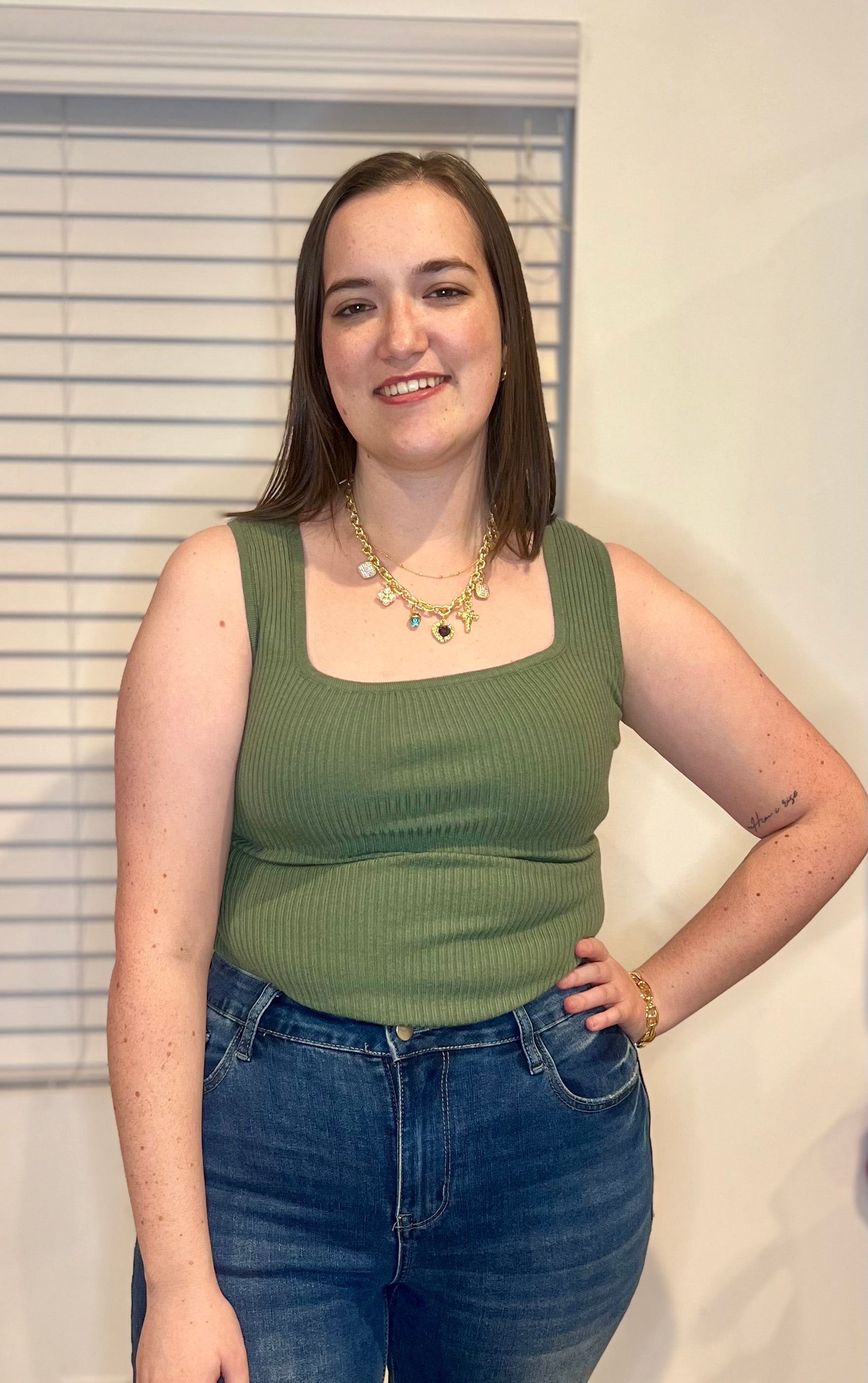 This bodysuit features a ribbed knit fabric that hugs in all the right places, offering a smooth and flattering fit. The square neckline adds a touch of modern sophistication, while the wide tank straps make it versatile for any season. Whether paired with denim, trousers, or skirts, The Lily transitions effortlessly from casual to chic. Available in a classic black and an ivy for a fresh, minimal look.