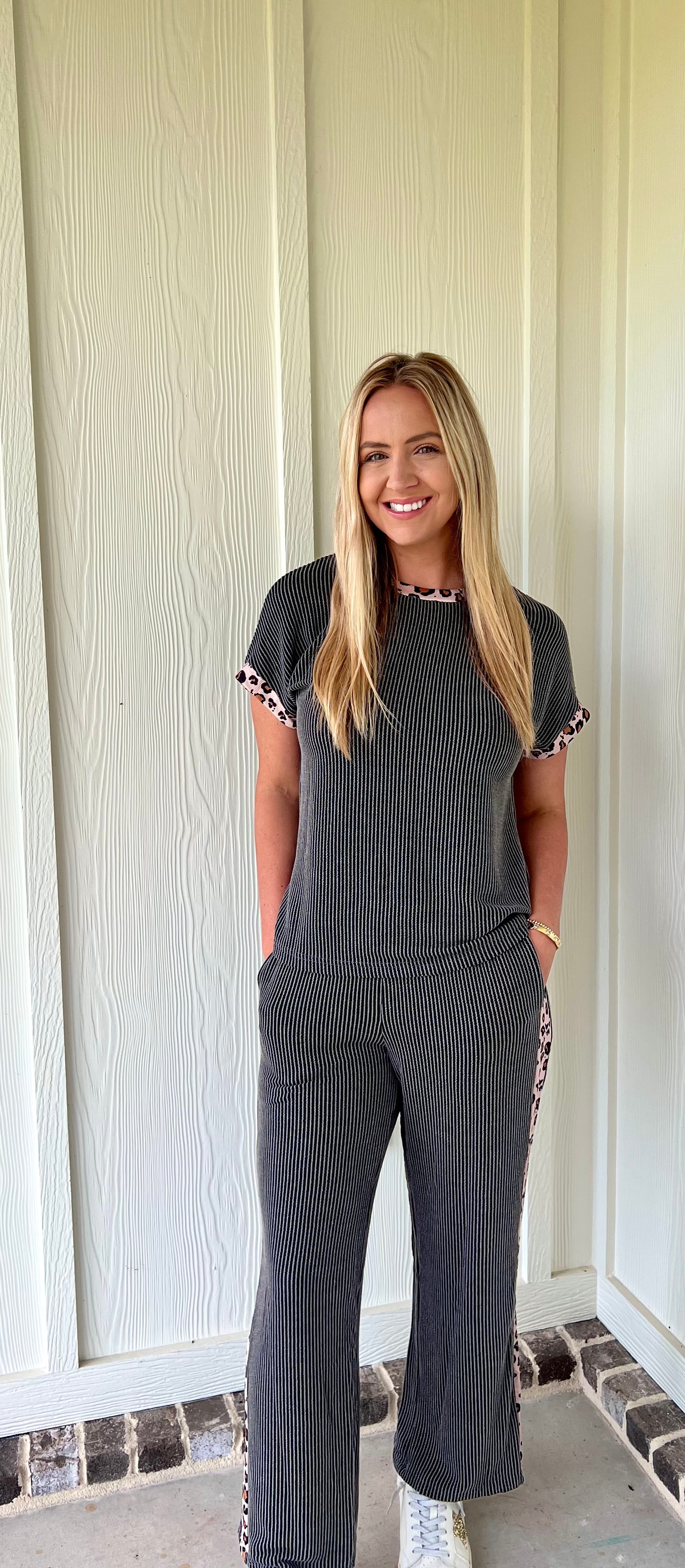 Effortlessly cool and wildly chic, the Urban Safari Set blends comfort with fierce street style. This two-piece ribbed knit set features a relaxed-fit top and matching high-waisted pants in a deep charcoal hue. Leopard-print trim accents the sleeves, neckline, and side seams—adding a bold pop of personality to this otherwise minimalist look. Finished with side pockets and a soft, stretchy fabric, this set is perfect for running errands or grabbing coffee in style. Pair it with statement sneakers and a fedora for the ultimate on-the-go outfit.